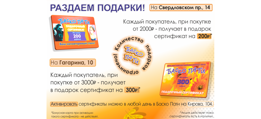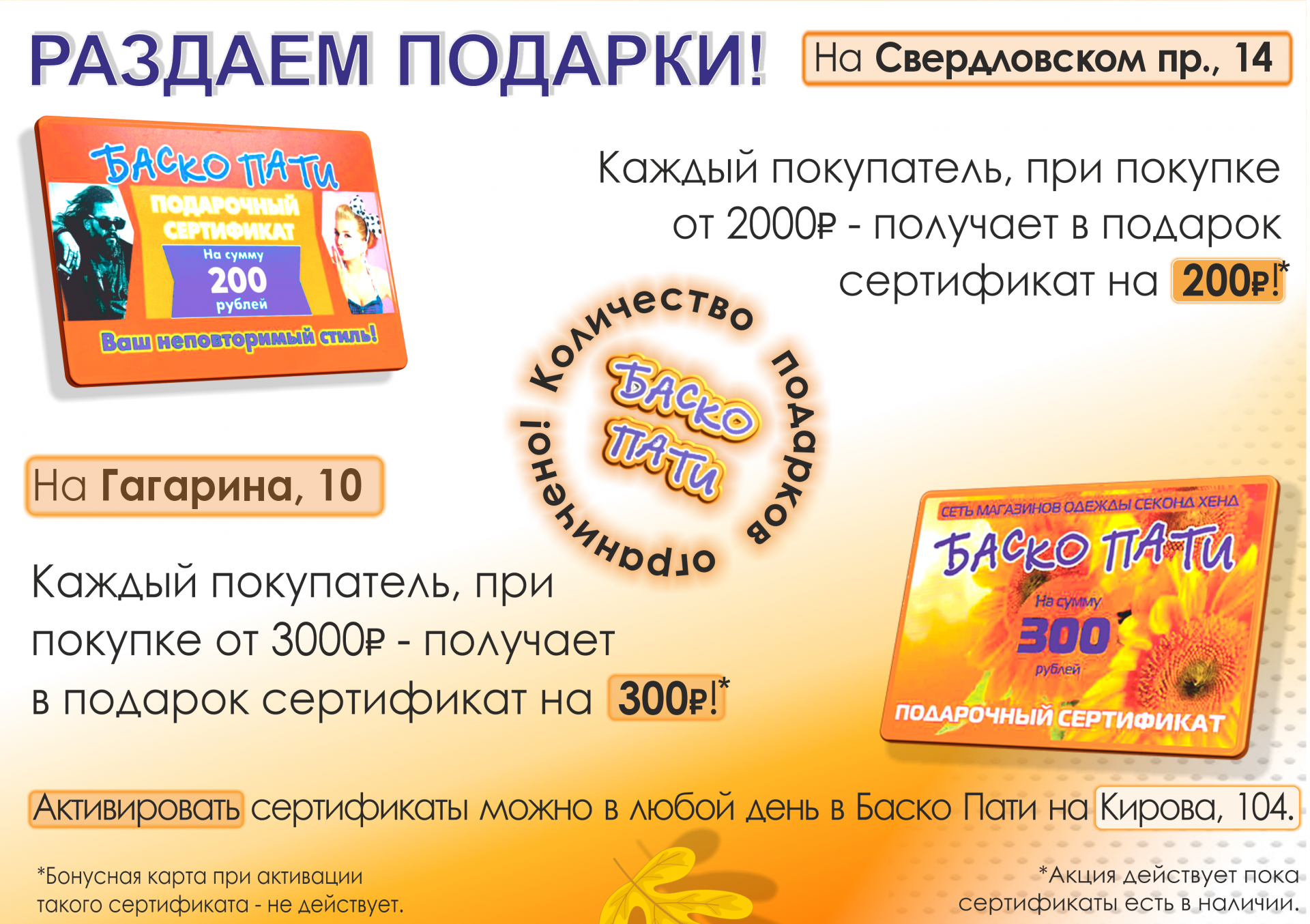 2. В магазине на Гагарина, 10: каждый покупатель, при покупке от 3000₽ - получает в подарок сертификат на 300₽!