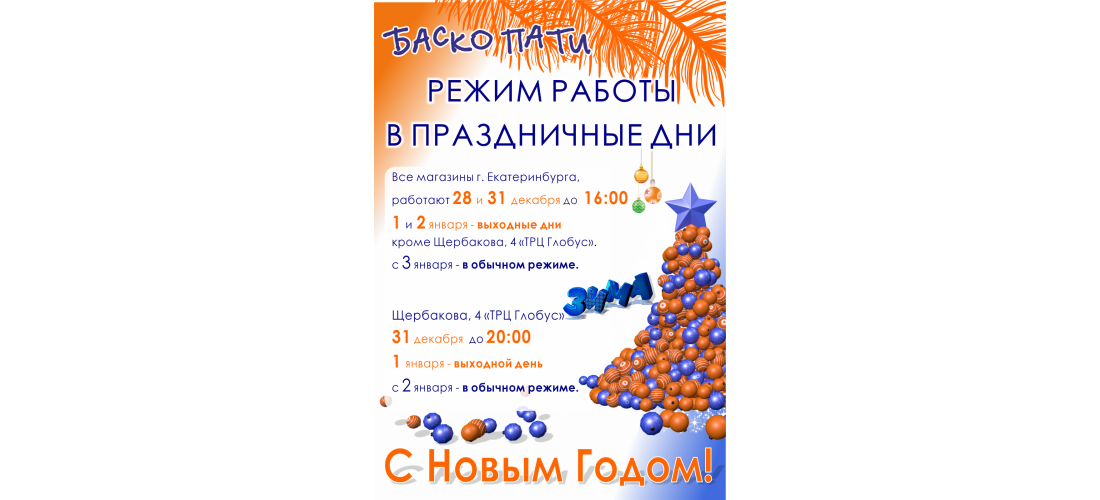 31 декабря все магазины г. Екатеринбурга* (*кроме Щербакова, 4 "ТРЦ "Глобус"), г. Перми, г. Челябинска и г. Каменска-Уральского работают до 16:00.