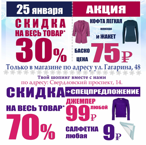 25 января НА ВЕСЬ ТОВАР СКИДКА 30%