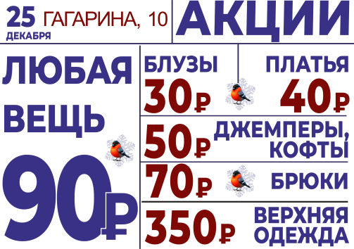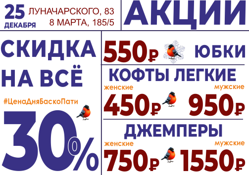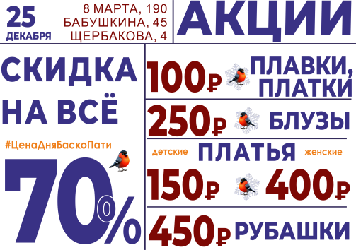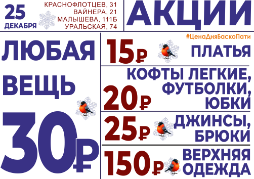 +АКЦИИ: ПЛАТЬЯ 15₽! ЮБКИ, ФУТБОЛКИ, КОФТЫ ЛЕГКИЕ 20₽! БРЮКИ, ДЖИНСЫ 25₽! ВЕРХНЯЯ ОДЕЖДА 150₽!